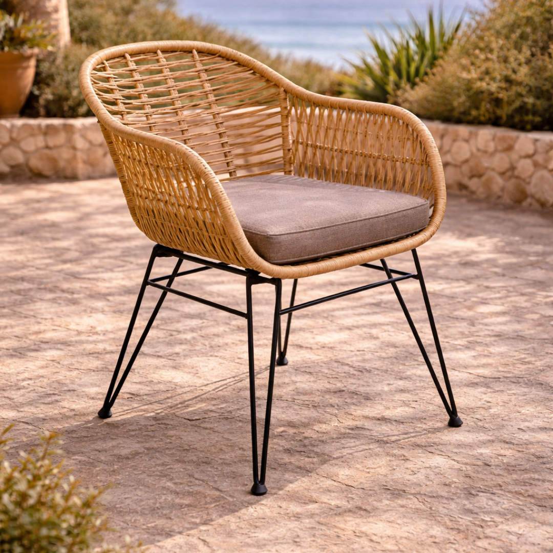 Introducing our exquisite collection of Polyrattan Dining Chairs with a sleek black steel frame and luxurious taupe-colored cushions. Elevate your dining experience with the perfect combination of style, durability, and comfort.