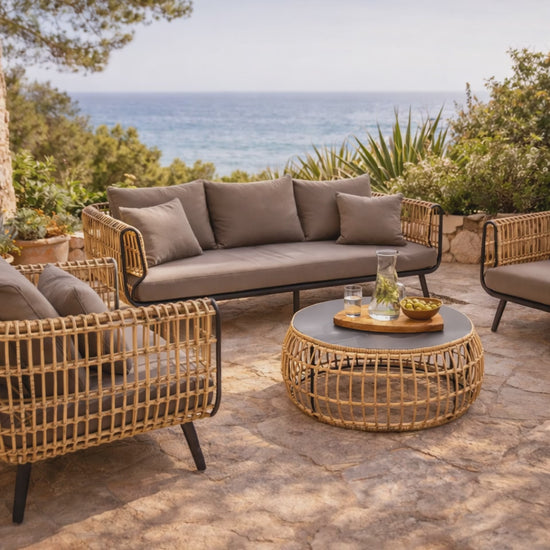 Introducing our exquisite Bali Polyrattan Lounge Set, meticulously designed to bring the essence of tropical paradise into your outdoor living space. With its sleek black aluminum frame and sumptuous taupe-colored cushions, this set creates a haven of comfort and style that transports you to a world of relaxation.